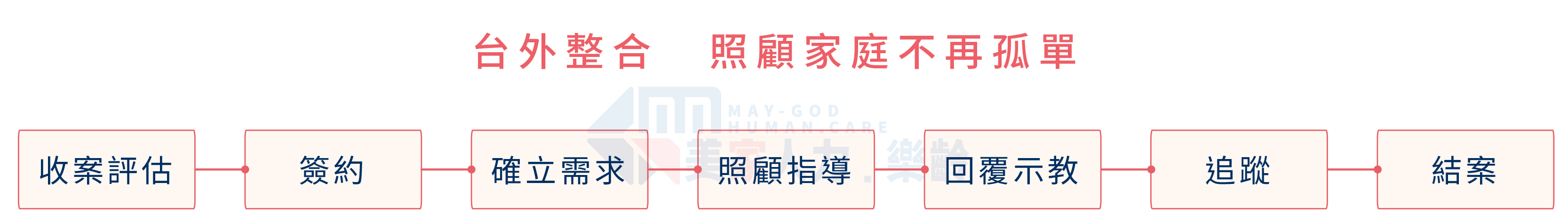美家人力整合台籍長照專業人員與外籍看護,依照長輩的需要量身定制照顧計畫,提供高品質照顧服務。為縮短外籍看護與雇主的磨合期,在外籍看護到職當天,由人力規劃師、翻譯老師、照顧指導師帶領外籍看護進場。由執有長照專業證照的照顧指導師,親自到宅指導外籍看護及家庭照顧者,學習如何正確提供失能者日常生活之照顧以及健康促進、認知訓練等協助。